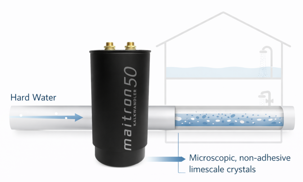 Unlike salt-based softeners, Maitron LimeSafe® works without salt, chemicals, or wastewater — protecting pipes while preserving natural water quality.
